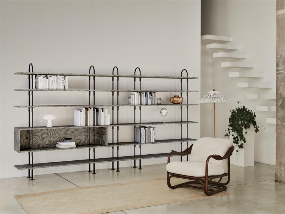 Systemet kan tilpasses både i højden og bredden, og det kan bruges fritstående, vægmonteret eller som rumdeler. Resultatet er en reol, der føles komplet i alle konfigurationer – og som understøtter de ting, vi vælger at omgive os med.