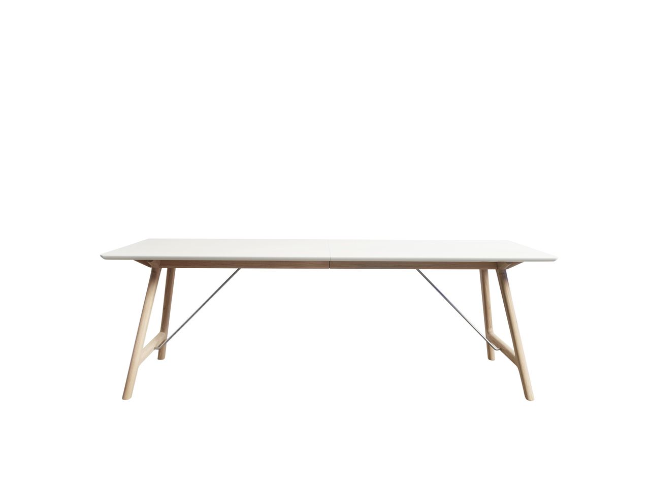 Ditlev Karsten har designet et nyt, klassisk og smukt spisebord i form af T7. Nyd det bløde formsprog og udtryk, som bordet vil give rummet. Bordpladen er fremstillet af hvid laminat, der er et yderst praktisk materiale, som kan tåle hyppig rengøring. Bordets understel er i massivt eg, som er et robust materiale, der har en lang levetid. T7 er i et design, der lader materialerne komme til deres ret, samtidig med det er praktisk og elegant. Der er udtræk til 4 tillægsplader, som let isættes og hurtigt giver ekstra plads ved bordet. Du kan vælge imellem 2 forskellige slags tillægsplader i farverne hvid eller sort, hvor den hvide tillægsplade passer til farven på bordpladen, mens den sorte farve vil skabe kontrast til bordpladen.