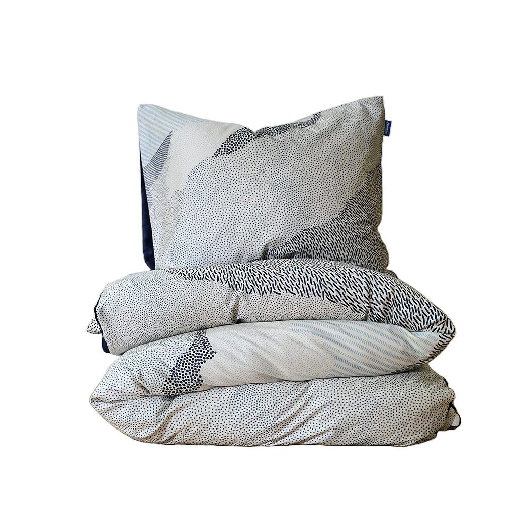 Camouflage sengetøjet fra Auping er fremstillet af 1005 bomuldssatin og har et flot, beroligende udtryk med sine striber og diskrete bølger i blå, grå og hvide nuancer. Bagsiden af sengetøjet er blåt, hvilket giver plads til variation i udtrykket.