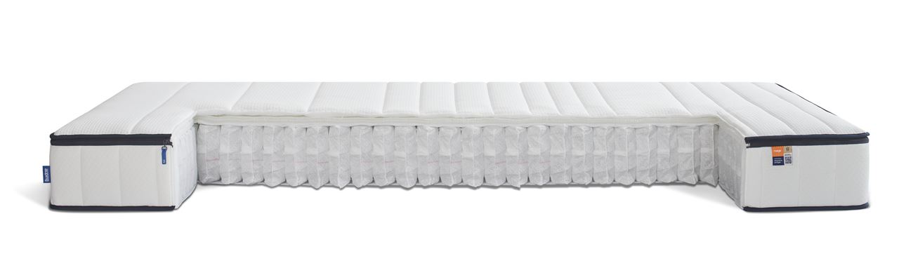 3 komfortzoner med 16 cm pocketfjedre af stål og polyesterfibre. Sidestykker i polyester. Underplade i hvid filt af polyester.