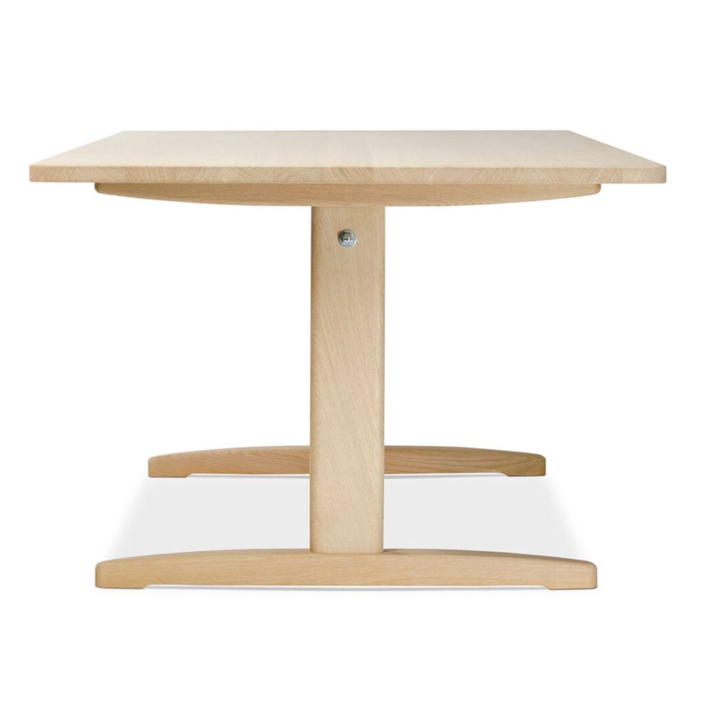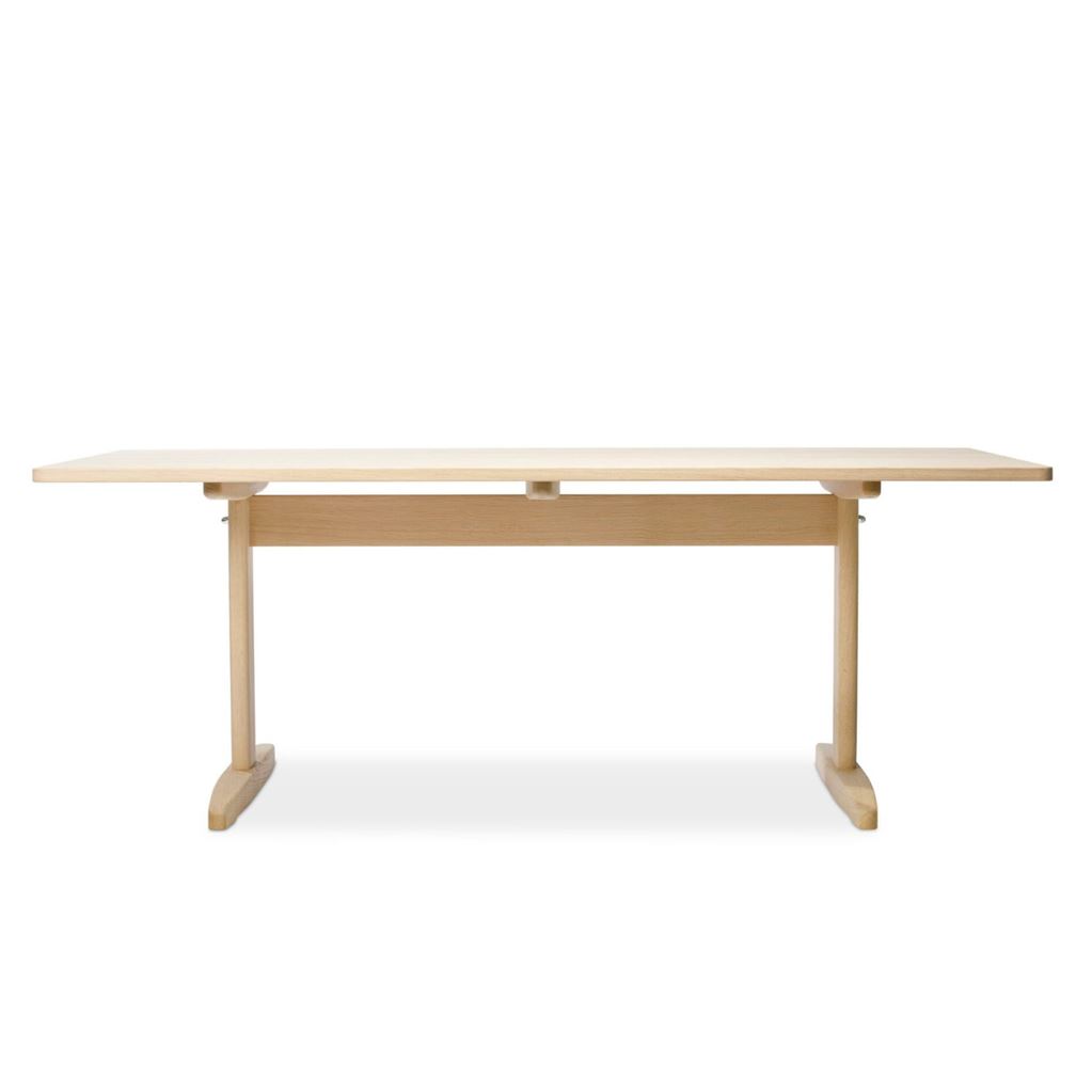 Smukt egetræsspisebord designet af Børge Morgensen. Shakerbordet var en bordtype Børge Mogensen blev ved med at vende tilbage til gennem sin karriere som møbelarkitekt. Med det elegante og unikke understel, der er trukket ind under bordpladen, virker den enkle, rektangulære plade til at svæve frit i rummet, og giver samtidig god plads til benene. Bordet, der med sin praktiske slidflade og afrundede kanter, er yderst funktionelt og vil være en skøn tilføjelse til indretningen.