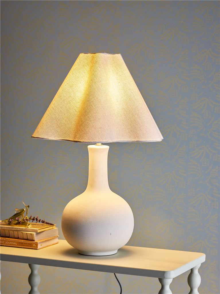 Heide bordlampen fra Bloomingville er en stilfuld, tone-i-tone lampe med en mat glasurfinish og en smuk, struktureret overflade. Den runde base og den bløde, kurvede skærm giver lampen et harmonisk og elegant udseende, der passer perfekt til moderne, minimalistiske indretninger. Ideel til at skabe en varm og indbydende stemning i stuen, soveværelset eller på kontoret.