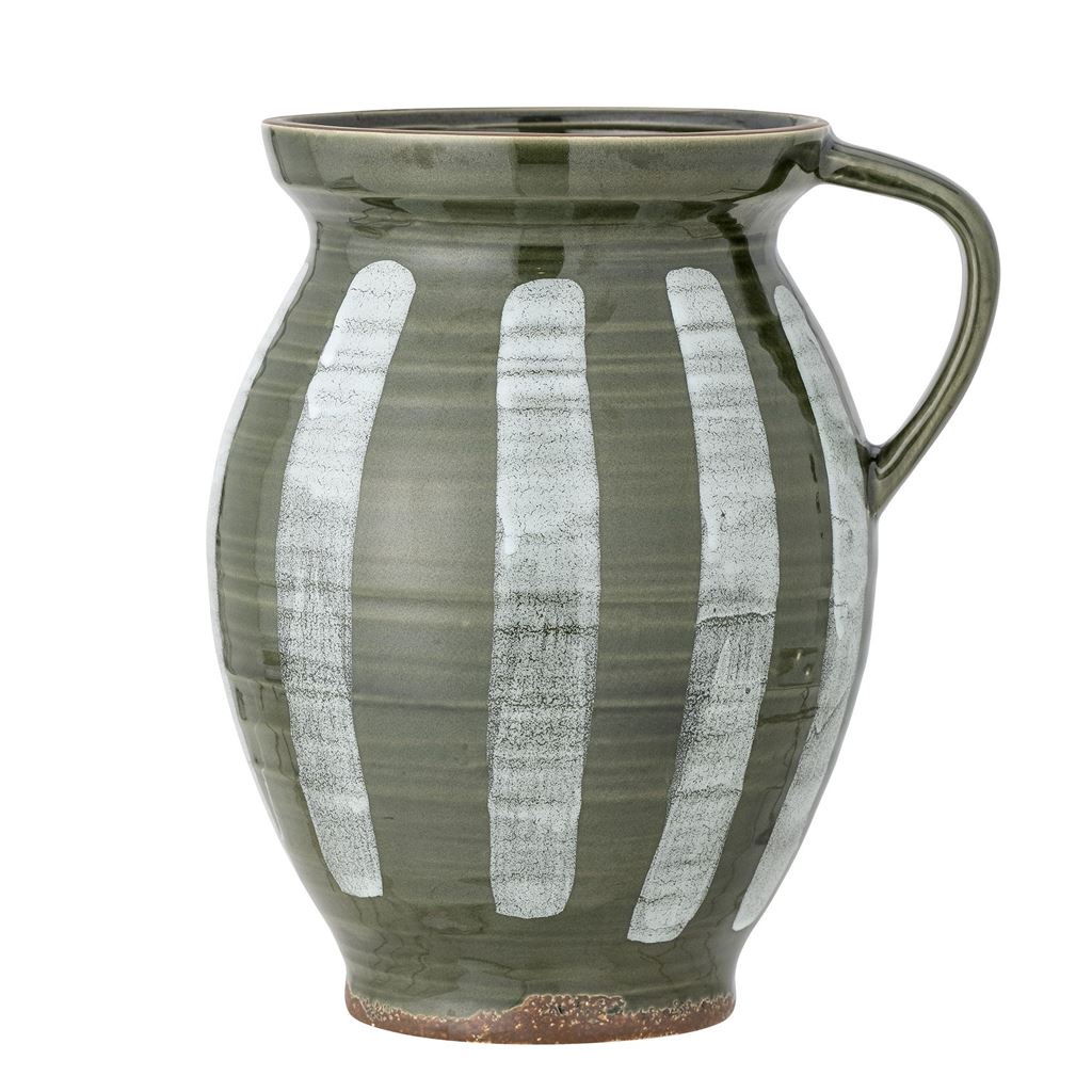 Frigg vasen fra Bloomingville er en stentøjsvase med en smuk glasur i grøn og lyseblå. Vasen er håndlavet og udseendet kan derfor variere fra vase til vase. Vasen har en hank på siden, hvilket er en fin lille detalje der både skaber karakter og giver vasen et kandelignede design. Placér vasen på havebordet på en dejlig sommerdag eller lad den pynte i vindueskarmen hvor den kan sætte en flot buket i fokus.