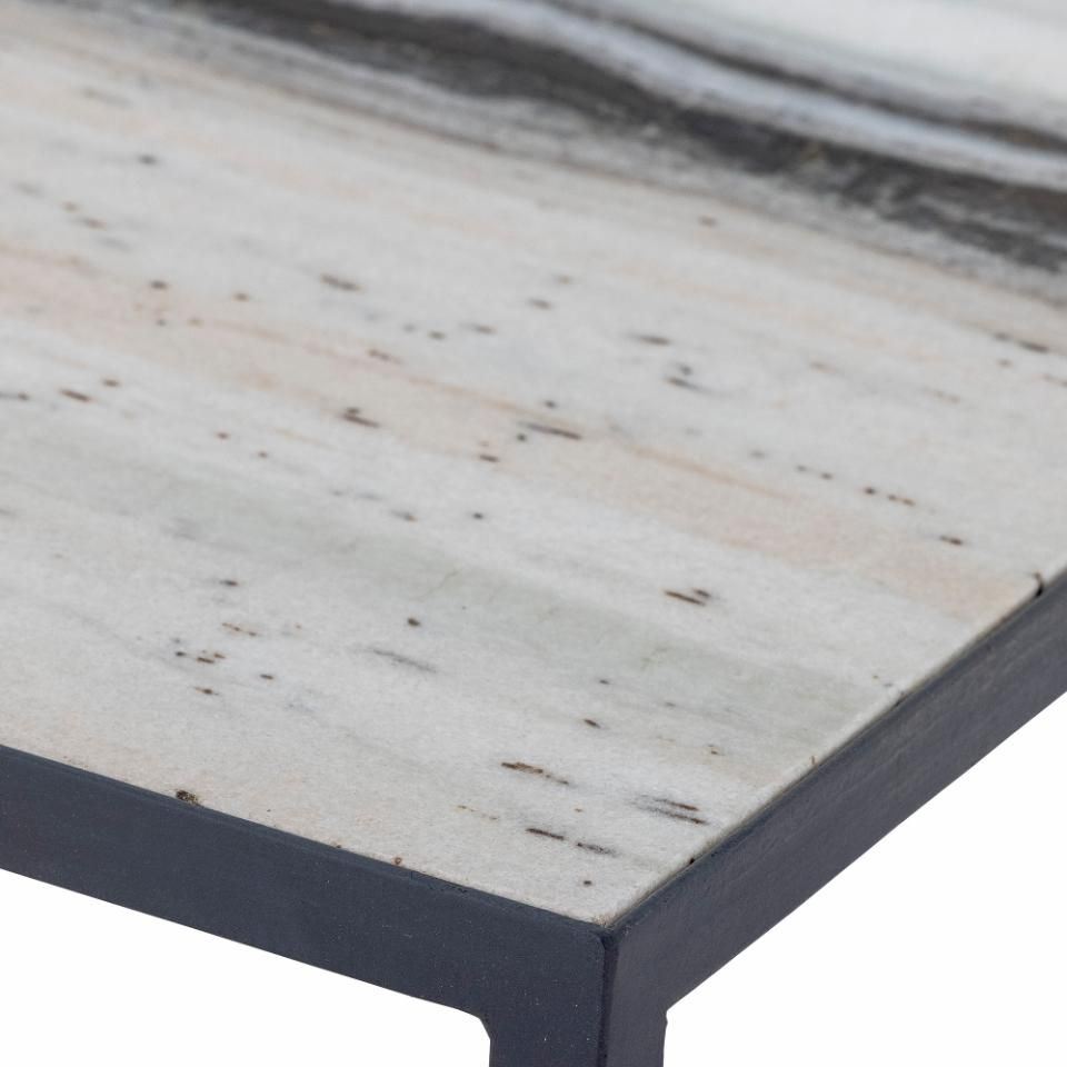 Ines Sofabord fra Bloomingville i smuk hvid marmor. Bordet har ben i sort metal, som skaber et simpelt og moderne udtryk der passer ind i mange indretninger. Bordpladen i marmor kan variere fra bord til bord, da det er et naturligt materiale, hvor nuancer og mønstrer er forskellige.