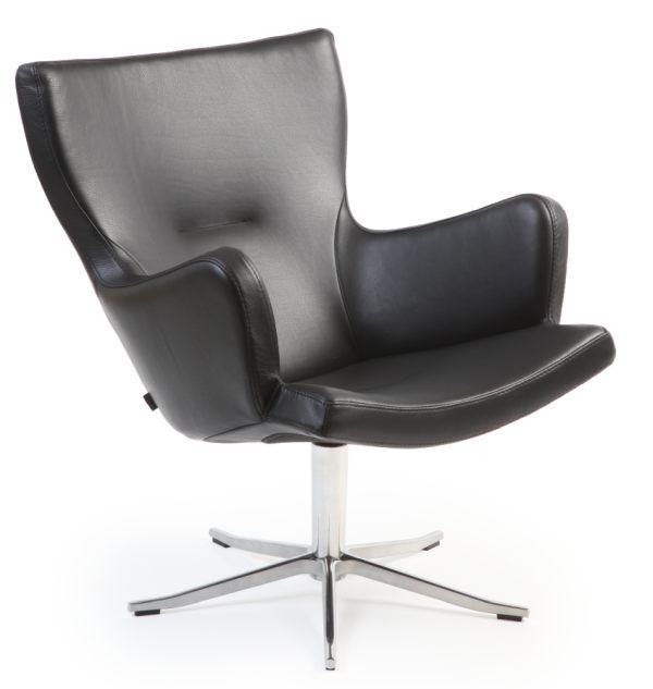 Gyro lænestolen fra Conform har et smukt design, og byder på rigtig god siddekomfort. Lænestolen er drejbar og har returdrej, så du altid kan være helt rolig når du rejser dig fra stolen, da den vil dreje tilbage til sit udgangspunkt. Stolen er med armlæn, og er betrukket med sort fantasy læder, et semianalinlæder. Stolen er 5-benet og er lavet af formstøbt aluminium. Stolen har et elegant design og stilrene linjer. Stolen er fleksibel når det kommer til indretning, dens former og polstring gør, at den nemt kan indgå i mange forskellige former for indretninger.
