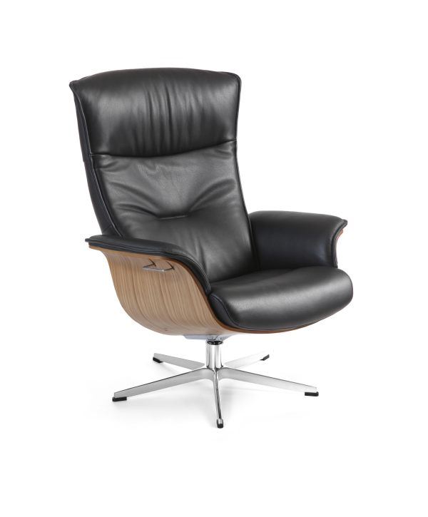Prime lænestolen fra Conform er en elegant tilføjelse til hjemmet. Stolen byder på en god siddekomfort, og er udstyret med returdrej, hvilket gør at når du rejser dig fra stolen, så drejer sædet tilbage til sin oprindelige position. Stolens skal er lavet af ubehandlet egetræ, sædet er polstret med sort Fantasy læder, et analinlæder som har fået en lille behandling som gør at spilte væsker ikke trækker ligeså hurtigt ind i læderet som læder uden behandling. Stolen har 5 ben af formstøbt aluminium. Stolen er behagelig at sidde i da analinlæder er et blødt materiale, og de rene linjer og neutrale farver får stolen til at passe ind i en bred række indretninger. Passende skammel kan købes til lænestolen.