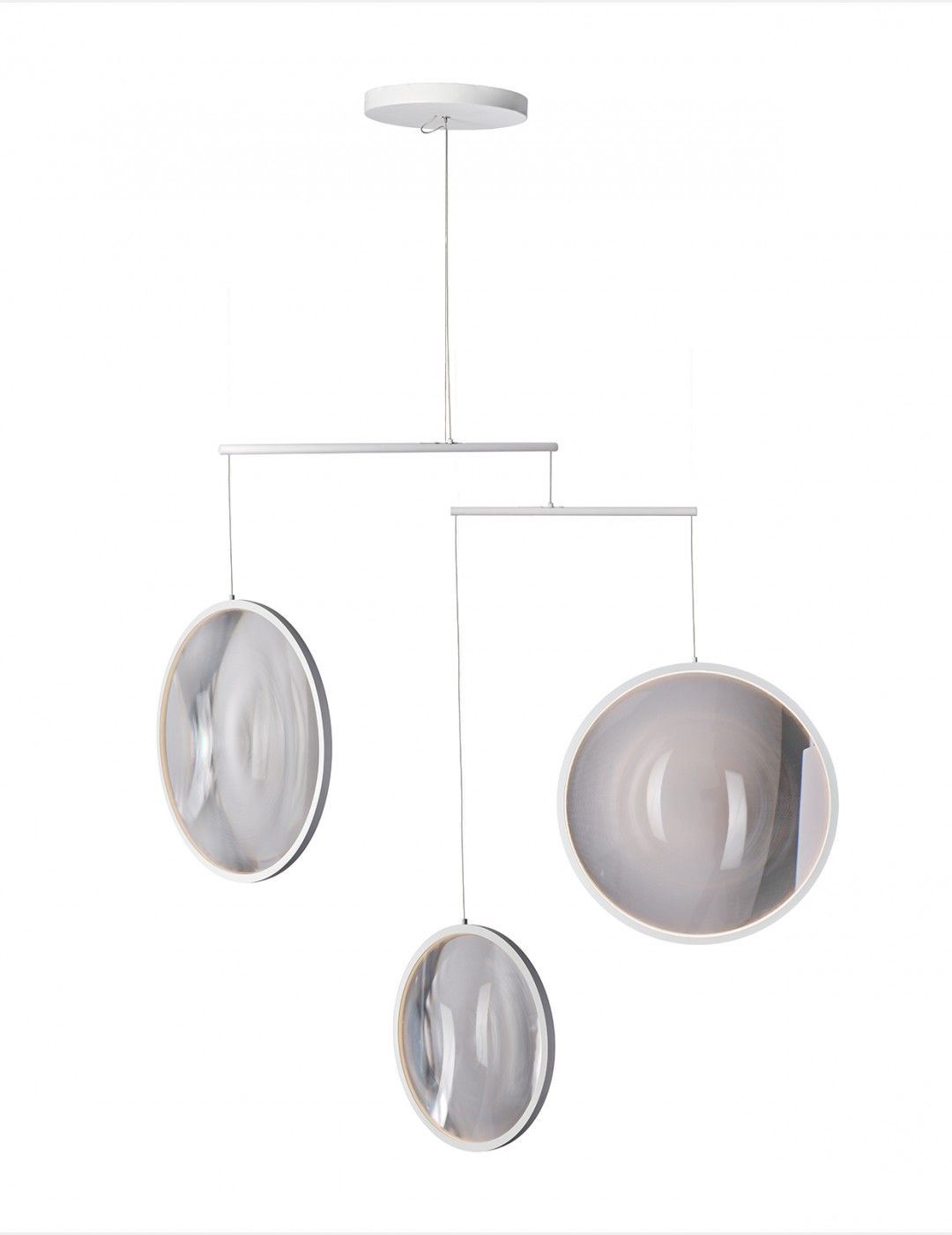 Unik og iøjnefaldende lysekrone fra DCW Editions. Med denne pendels volumen og enestående udformning er Focus en belysningsløsning, der vækker beundring hos beskueren. Focus består af en stor uro af aluminium, hvorpå der er monteret tre lysene skiver, som svæver vægtløst i rummet. Lamperne skaber associationer til store sæbebobler, som skaber optiske effekter. Med sit skulpturelle udtryk og dynamiske belysning er Focus derfor som en kunstinstallation i loftet. Brug den i spisestuen over spisebordet, i stuen over sofabordet, i en hall eller et helt fjerde sted med højt til loftet, hvor lysekronens smukke design kommer til sin fulde ret. Focus fås enten med tre eller fem lamper, ligesom den også fås i enten sort eller hvid. Lampen har integreret LED lyskilder.