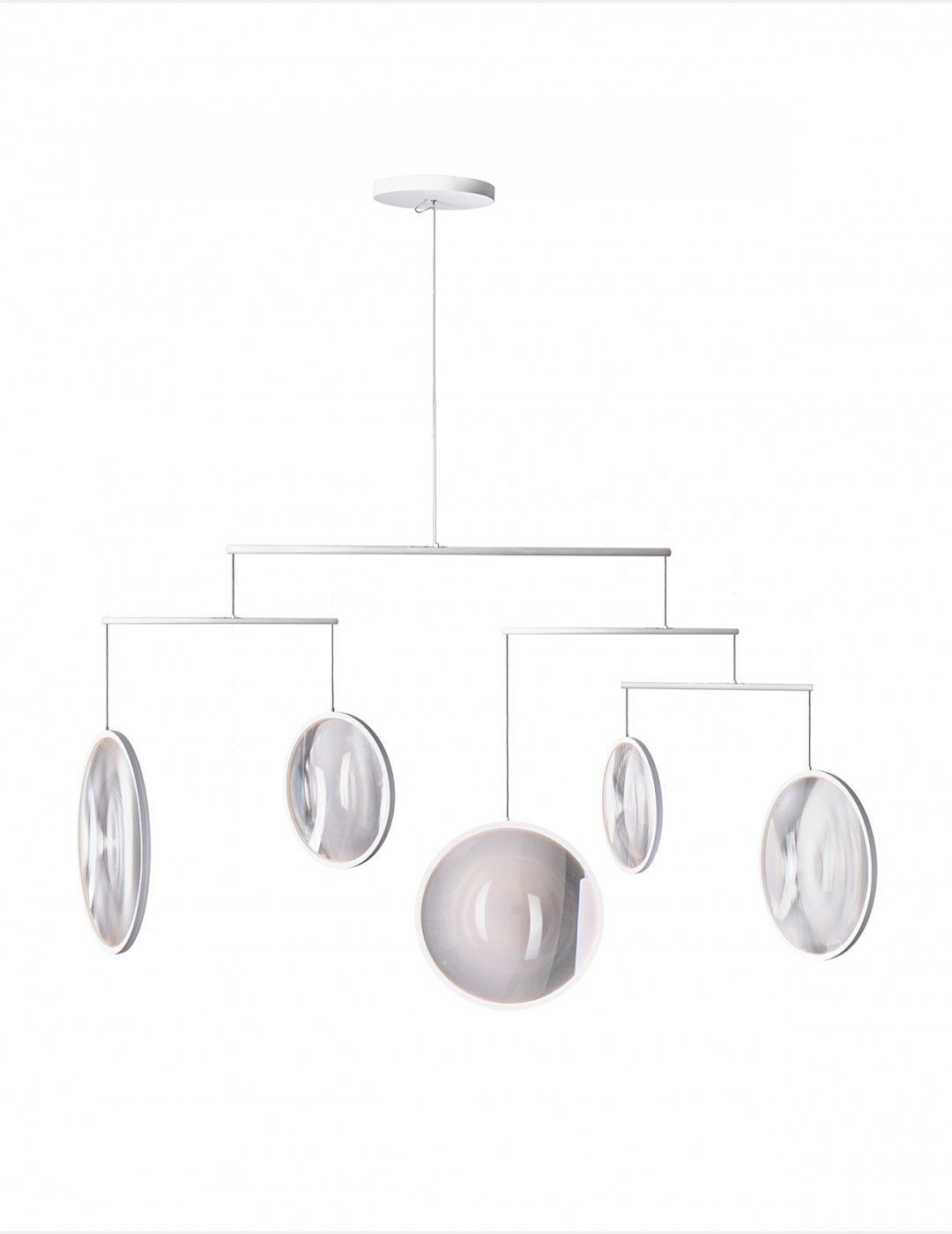 Unik og iøjnefaldende lysekrone fra DCW Editions. Med denne pendels volumen og enestående udformning er Focus en belysningsløsning, der vækker beundring hos beskueren. Focus består af en stor uro af aluminium, hvorpå der er monteret tre lysene skiver, som svæver vægtløst i rummet. Lamperne skaber associationer til store sæbebobler, som skaber optiske effekter. Med sit skulpturelle udtryk og dynamiske belysning er Focus derfor som en kunstinstallation i loftet. Brug den i spisestuen over spisebordet, i stuen over sofabordet, i en hall eller et helt fjerde sted med højt til loftet, hvor lysekronens smukke design kommer til sin fulde ret. Focus fås enten med tre eller fem lamper, ligesom den også fås i enten sort eller hvid. Lampen har integreret LED lyskilder.