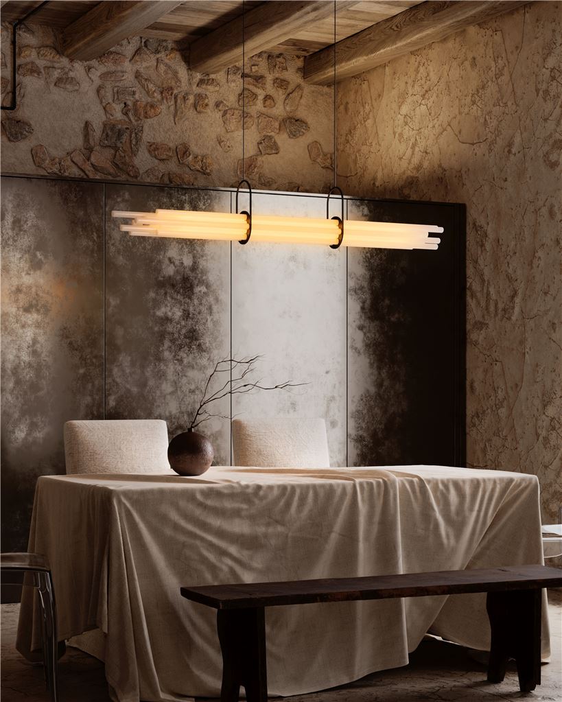 Denne lampe er designet til at oplyse et stort spisebord og er monteret i en innovativ trompe l'oeil-stil. Den består af tolv glasrør, hvoraf kun ét fungerer som selve lyskilden, mens de øvrige rør spreder lyset gennem brydning og prismatiske effekter. Der er ingen synlige ledninger, LED’er eller aluminiumsstruktur – NL12 fremkalder en næsten himmelsk lysstråle, der både er radikal og poetisk.