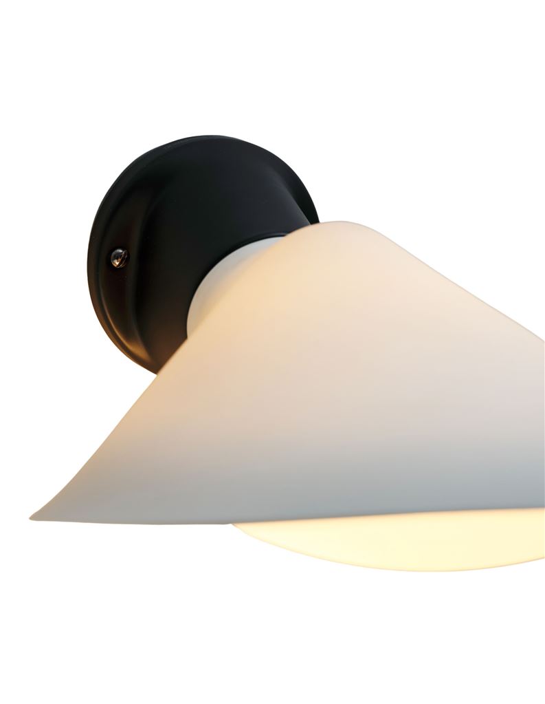 Væglampe med sort aluminiumsbase og hvid porcelænsreflektor. Den hedder PLUME på grund af dens delikate design, bløde linjer og den varme belysning, den skaber. Den koniske lampeskærm er fint skulptureret.