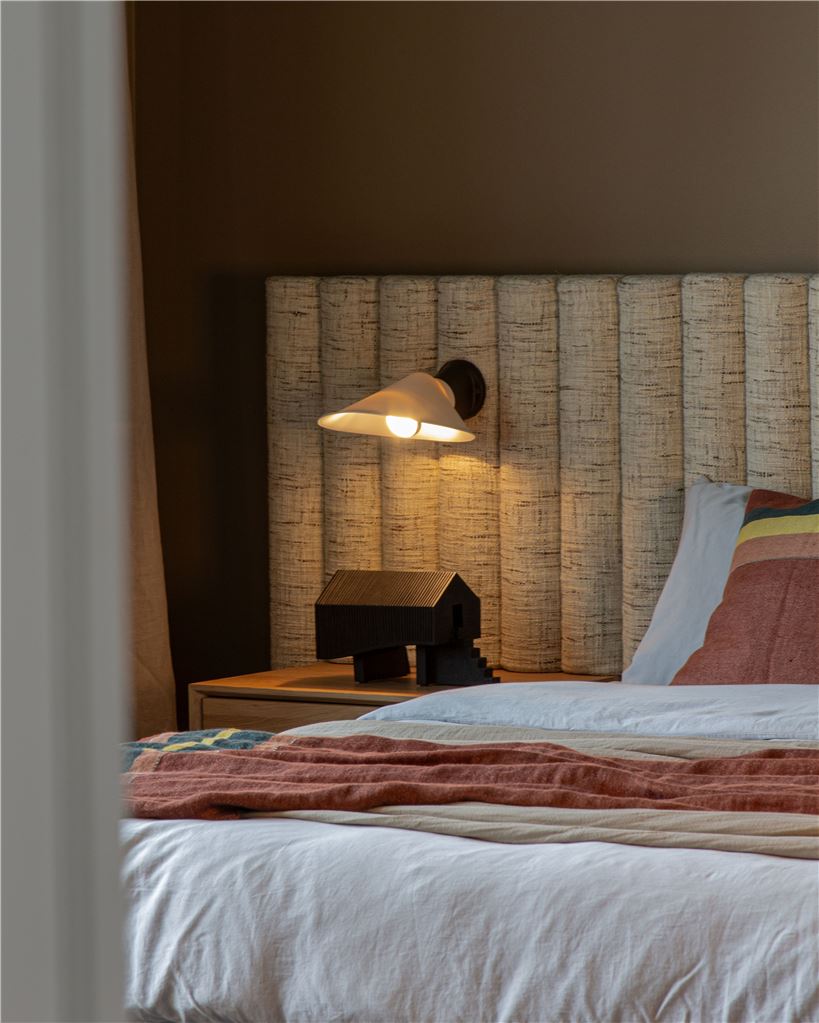 Væglampe med sort aluminiumsbase og hvid porcelænsreflektor. Den hedder PLUME på grund af dens delikate design, bløde linjer og den varme belysning, den skaber Se mere ...