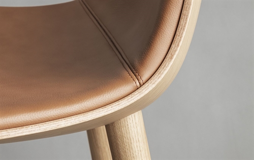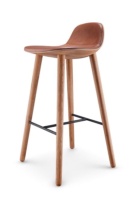 Det 3D formpressede finér giver stolen en smuk bøjet og gennemtænkt bagside og den bløde inderside af støbt skum med læderbetræk gør stolen behagelig at sidde i længe ad gangen. Barstolen gør sig godt i køkkenet med sit enkle design i rene linjer.