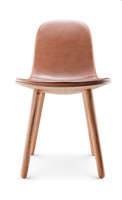 Det 3D formpressede finér giver stolen en smuk bøjet og gennemtænkt bagside og den bløde inderside af støbt skum med læderbetræk gør stolen behagelig at sidde i længe ad gangen.