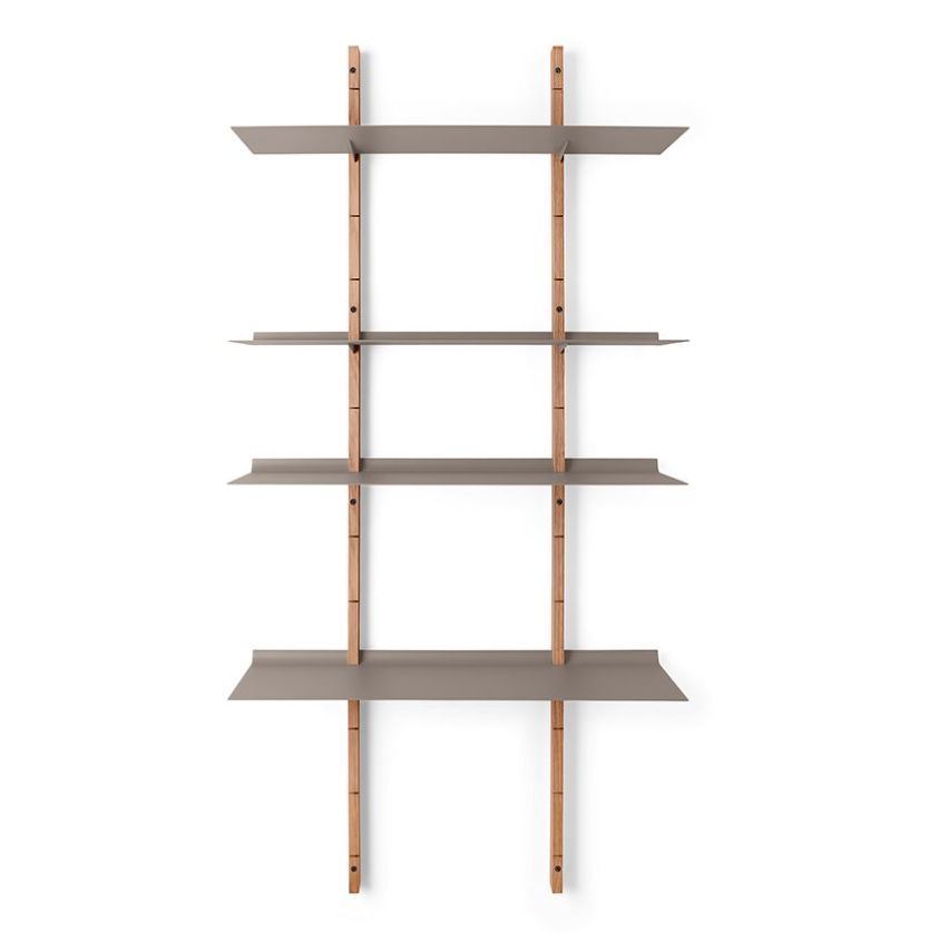 Smukt og elegant, væghængt reolsystem fra Please Wait To Be Seated. Reolen er fleksibel og simpel i sin funktion, og giver dig mulighed for at udstille dine yndlingsting i hjemmet. Reolens navn kommer af de smil-formede spalter i de faste egetræssider, hvori hyldernes buede bagkant indsættes. Hylderne kan placeres med lige netop den afstand imellem, som du ønsker, således at både større og mindre nipsting kan finde en smuk plads på hylderne. Grundet reolens særlige geometri, behøves hverken ekstra beslag eller stifter, når hylderne flyttes rundt. Derfor kan du nemt opbygge reolen, så den passer til dit hjem og flytte rundt på den, når behovet ændrer sig. Samtidigt har hylderne en buet bagkant, der sikrer, at bøger og andre objekter ikke skraber mod væggen.