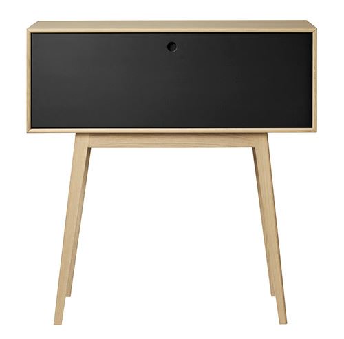 Stilren sekretær med æstetisk finesser. Sekretæren er praktisk, bag lågen er der god plads til opbevaring af fx bøger, blokke og skriveredskaber. Og den lille skuffe kan fx bruges som brevbakke. Når lågen er klappet ned, kan den bruges som skrivebord. Den stilrene design gør at den ikke dominerer for meget i rummet. Den høje sokkel giver en god brugshøjde og får skænken til at virke let og elegant, nærmest svævende. For designerne skulle møbler formes, så man får lyst til at bruge dem - også 10 år efter.