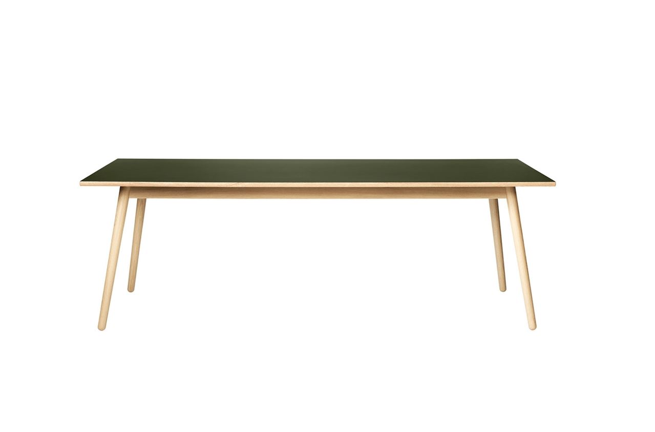 Bordpladen er fremstillet i sort linoleum, mens understel, udtræksrigler og ben er fremstillet i massiv eg. Træet som er benyttet, er FSC-certificeret fra europæiske skove.