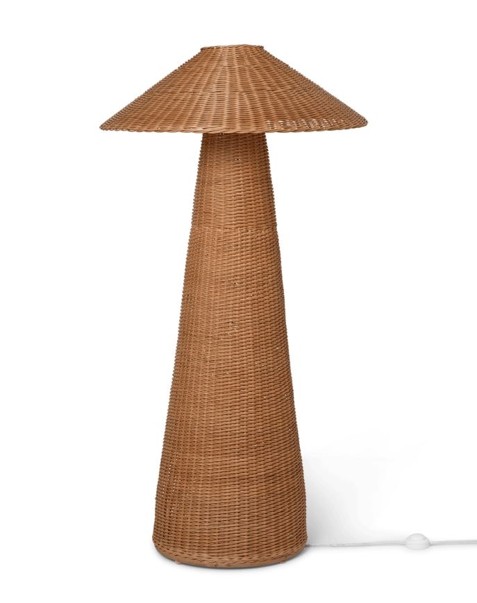 Smuk, håndlavet gulvlampe fra Ferm Living. Lampen er fremstillet i rattan, hvilket er en skøn kontrast til de geometriske former i lampens design. Lampen har store dimensioner og et blødt, behageligt lys, som på fineste vis bryder igennem mønsteret på lampeskærmen.