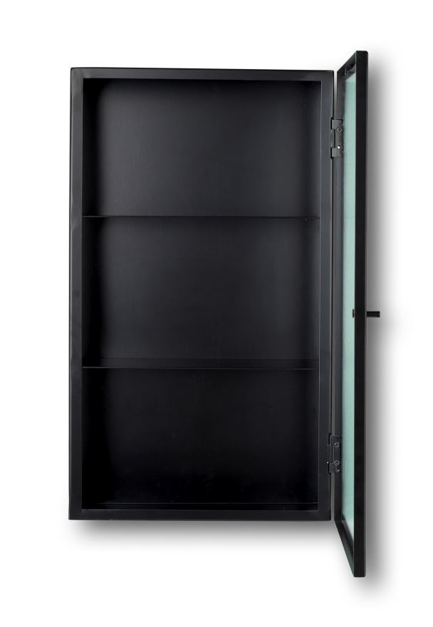 Det flotte Haze vægskab har den samme industrielle æstetik som Haze vitrineskabet, og er som navnet antyder et praktisk, vægmonteret skab til opbevaring af de mindre genstande. Hæng skabet i entréen eller gangen, og opbevar de småting der normalt måske flyder lidt som nøgler, cykellygter eller solbriller. Eller hæng det på badeværelset, og brug det til dine yndlings-skønhedsprodukter, eller andre småting der normalt er på badeværelset. Skabet er udformet i pulverlakeret stål, og det riflede glas sørger for at holde nysgerrige øjne på afstand. To pulverlakerede metalhylder inkluderet.