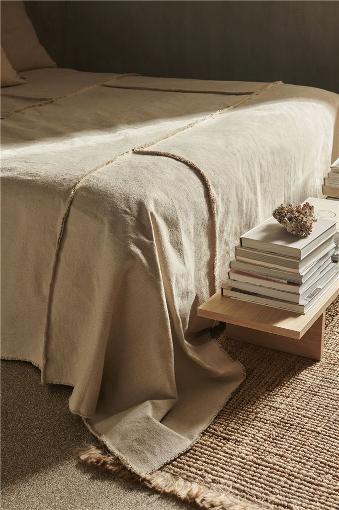 Bring et element af ubekymret ro ind i dit soveværelse med dette offset sengetæppe. Sengetæppet er lavet af ufarvet, tungvægts, GOTS-certificeret, økologisk bomuld, og har en smuk struktureret overflade. Som en dekorativ detalje er frynser blevet tilføjet til sømmene på offset sengetæppet for at understrege dets taktile, fredfyldte udtryk.