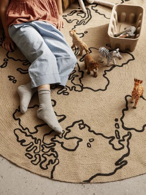 Dette cirkulære tæppe fra Ferm Living er vævet i naturlig jute og er dekoreret med et trykt verdenskort. De naturlige farvetoner i dette holdbare materiale sikrer, at det passer ind i ethvert hjem. Placer det i midten af et børneværelse til brug som legetæppe eller ved siden af børnenes seng for at holde små tæer varme om morgenen.