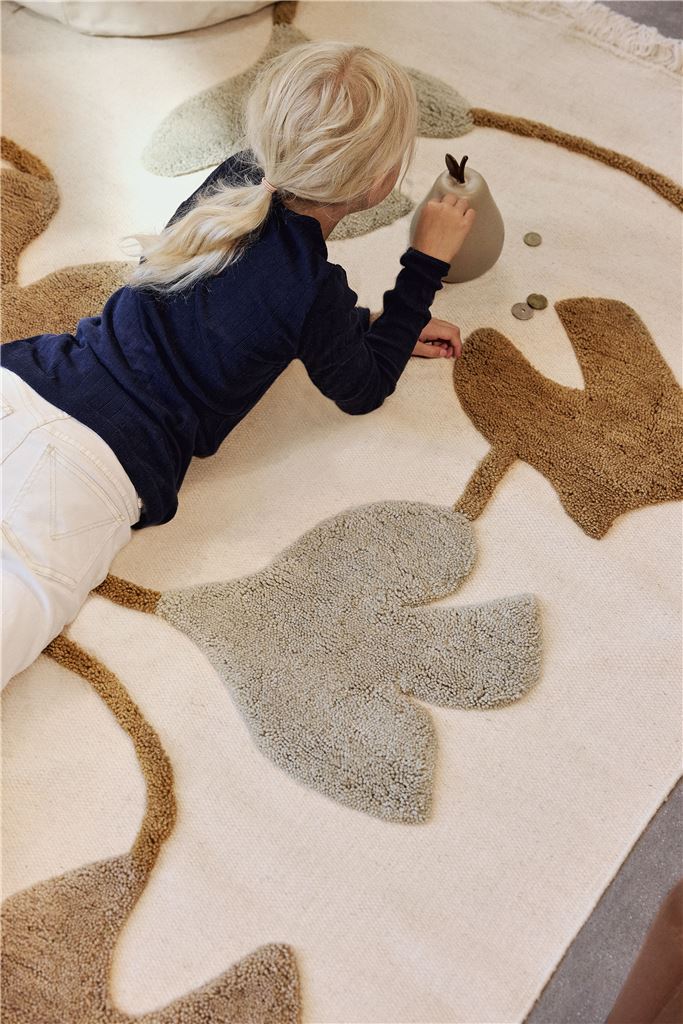 Swif Uldtæppe med fugle er vævet i uld og forener en fladvævet base med håndtuftede fuglemotiver, der smukt gengiver fuglenes yndefulde bevægelser i luften. Den afdæmpede farvepalet tilfører et legende, men diskret udtryk, der gør tæppet let at indpasse både i børneværelset og i hjemmets fællesrum. Med sin bløde struktur og varme fornemmelse under fødderne giver tæppet rummet både komfort og personlighed.