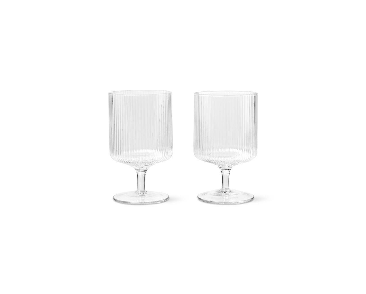 Fra Ferm Living kommer disse mundblæste vinglas i karakteristisk form, der ligesom resten af Ripple-serien har den særlige riflede overflade og geometriske silhuetter, som gør glassene stabelbare. Hvad enten du ønsker at bruge glassene til drinks ved havefesten eller til en hyggelig aften i venners lag, så vil glassene fuldende ethvert arrangement og du kan servere dine yndlings drinks med stil.