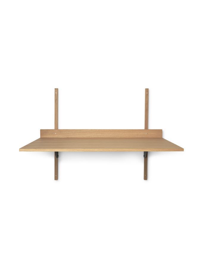 Dette nye og moderne skrivebord fra Ferm Living er i sin enkelhed og klassiske kombination af træ og messing perfekt til at skabe et unikt og hyggeligt arbejdsmiljø. Brug Sector Desk som et enkeltstående skrivebord, eller kombiner det med Sector hylder efter eget valg for at danne et integreret og sammenhængende arbejdsområde hvor du f.eks kan have bøger og skriveredskaber opbevaret. En kort kant i slutningen af skrivebordet danner et lille smalt rum, der er ideel til at støtte håndskrevne noter eller et dit yndlingsbillede.