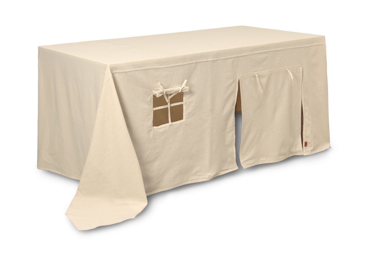 Det smart Settle Table Cloth House fra Ferm Living er enhver families drøm. Blot ved at ligge det udover familiens spisebord, så er det bygget et smart legefort til børnene. Her kan børnene medbringe deres yndlingsbøger og-legetøj eller give sig hen til det kreative. Det ufarvet postindustriel bomuld består af en dør og tre vinduer, som kan rulles op, så børnene har mulighed for at tage et kig ud af deres fine hule.