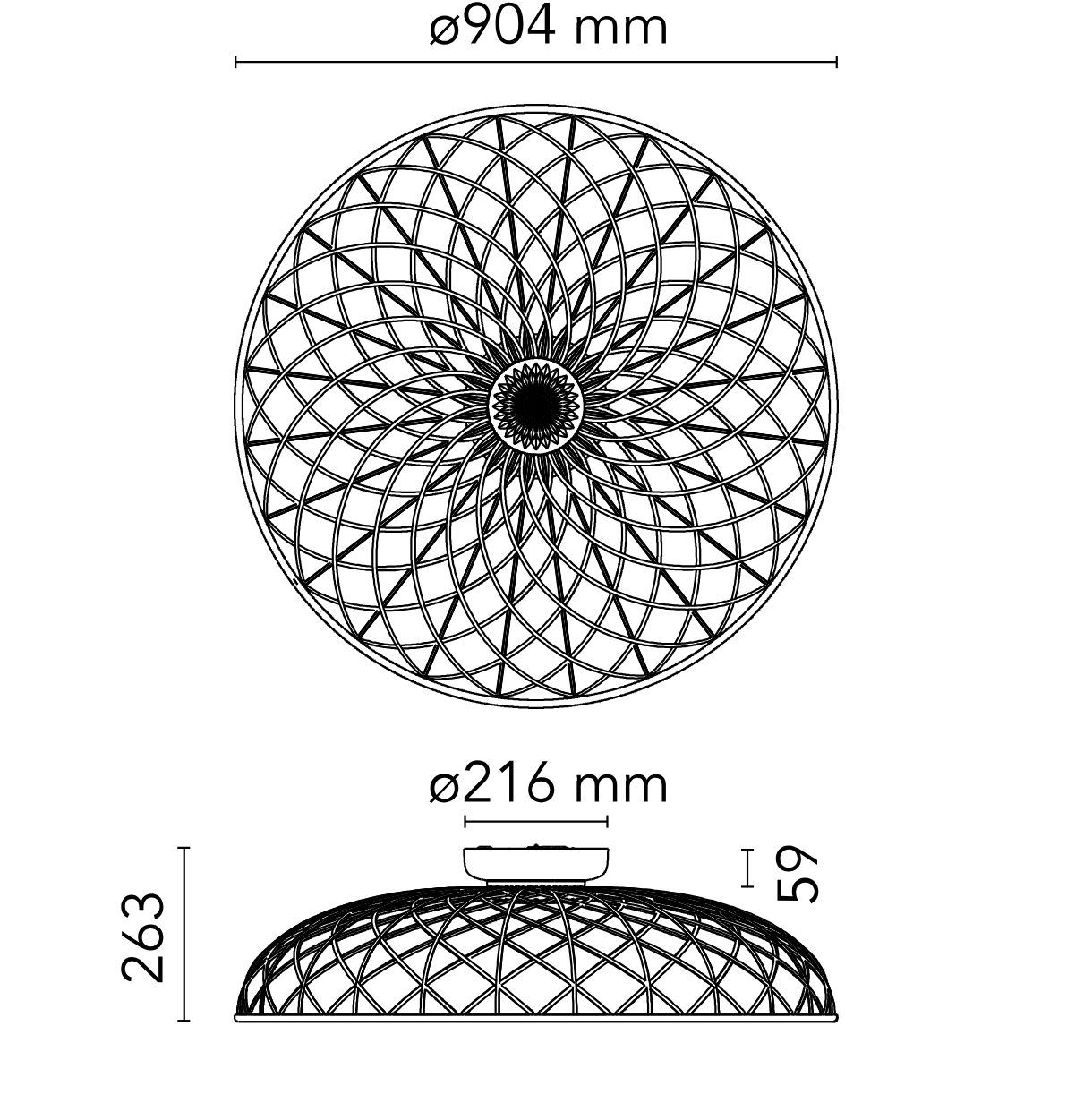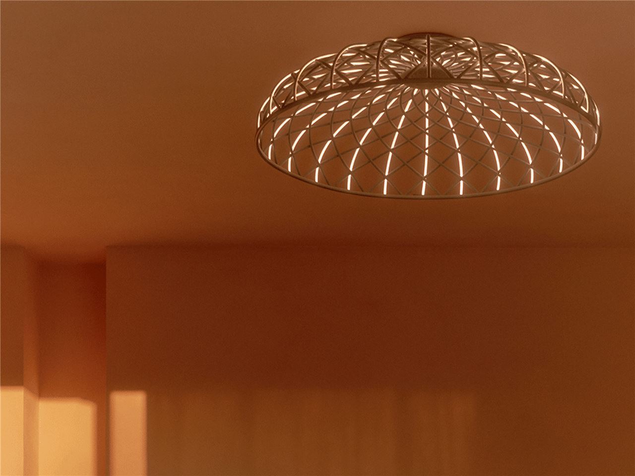 Skynest fra FLOS er en rå, elegant loftlampe. Den består af en kuppel, en kombination af lysende og mørke elementer arrangeret og sækket af et tyndt sammenvævet farverigt rørformet net, samlet med en aluminiumsring. Lampen kaster et diffust lys og hvert lyselement er drevet af specielle mikrostik placeret i toppen af kuplen. Loftlampen er udstyret med et indbygget balanceringssystem i toppen af kuplen, hvilket bidrager til lampens stabilitet. Lampen er samlet uden brug af lim og kan adskilles helt for at blive genbrugt eller repareret. LED lyskilde er integreret.