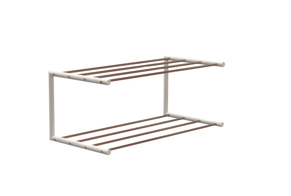 Elegant dobbelt skohylde fra FROST. Skohylden har en længde på i alt 61,9 cm, og måler 60 cm mellem skuehullernes midtpunkter. Skohylden er lavet i rustfrit stål og har et poleret kobber og mat hvid finish. Hylden er en del af NOVA serien, bestående af tilbehør til garderobe, badeværelse og køkken. Brug skohylden i gangen, entréen eller måske soveværelset. Fødder til skohylden kan tilkøbes.
