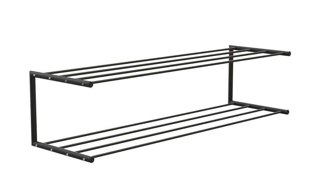 Elegant dobbelt skohylde fra FROST. Skohylden har en længde på i alt 101,9 cm, og måler 100 cm mellem skuehullernes midtpunkter. Skohylden er lavet i rustfrit stål og har et mat sort finish. Hylden er en del af NOVA serien, bestående af tilbehør til garderobe, badeværelse og køkken. Brug skohylden i gangen, entréen eller måske soveværelset. Fødder til skohylden kan tilkøbes.