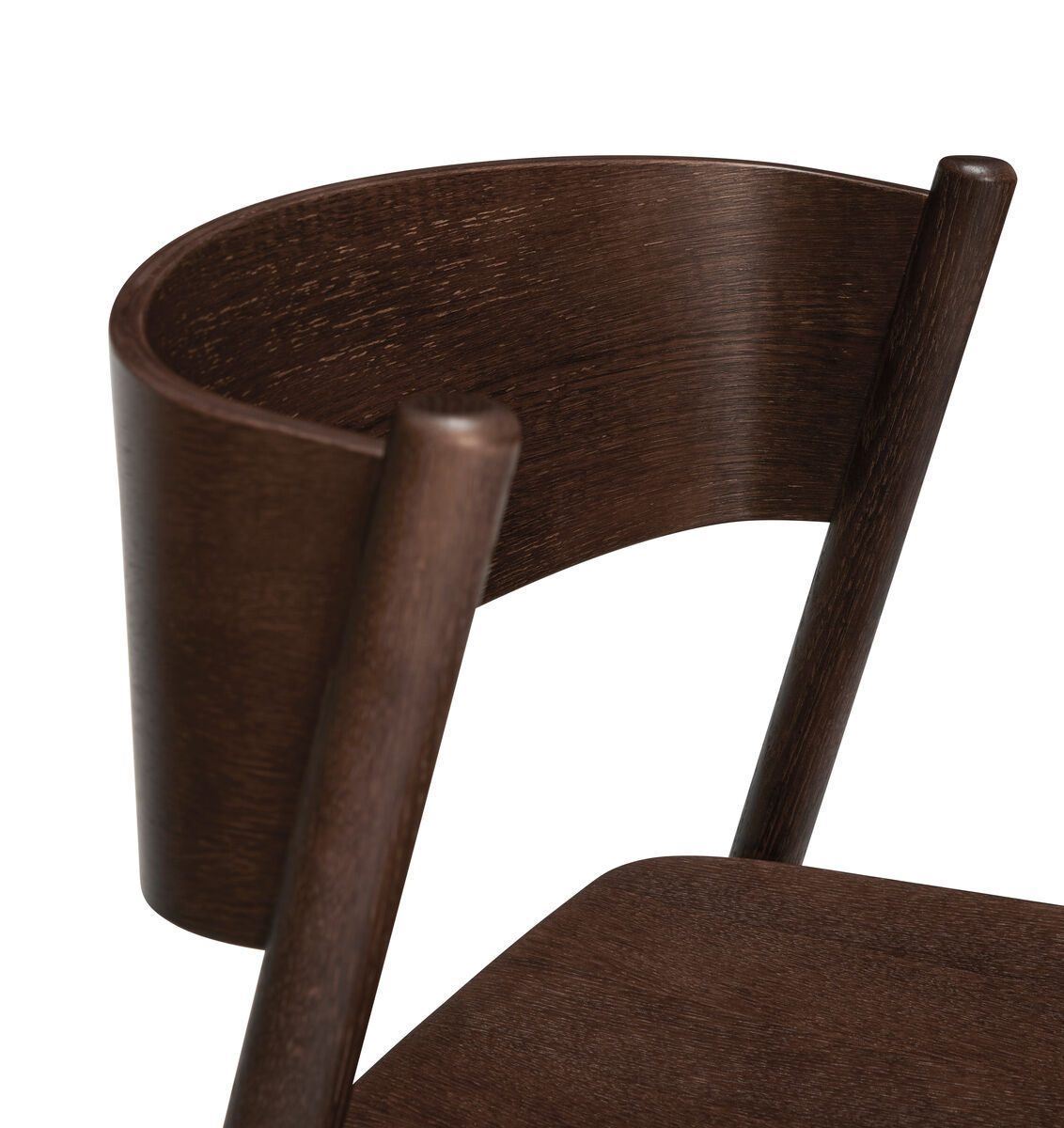 Den elegante Oblique spisebordsstol fra Hübsch udstråler skandinavisk design med sine rene linjer og smukke enkelthed. Stolen har en flydende overgang fra ben til ryg og de karakteristiske skrå linjer, som byder et behageligt velkommen. Stolen er fremstillet af FSC®-certificeret mørkbejdset træ med en flot mat lakering. Oblique er stabelbar så den let kan stilles til side, når den ikke bruges.
