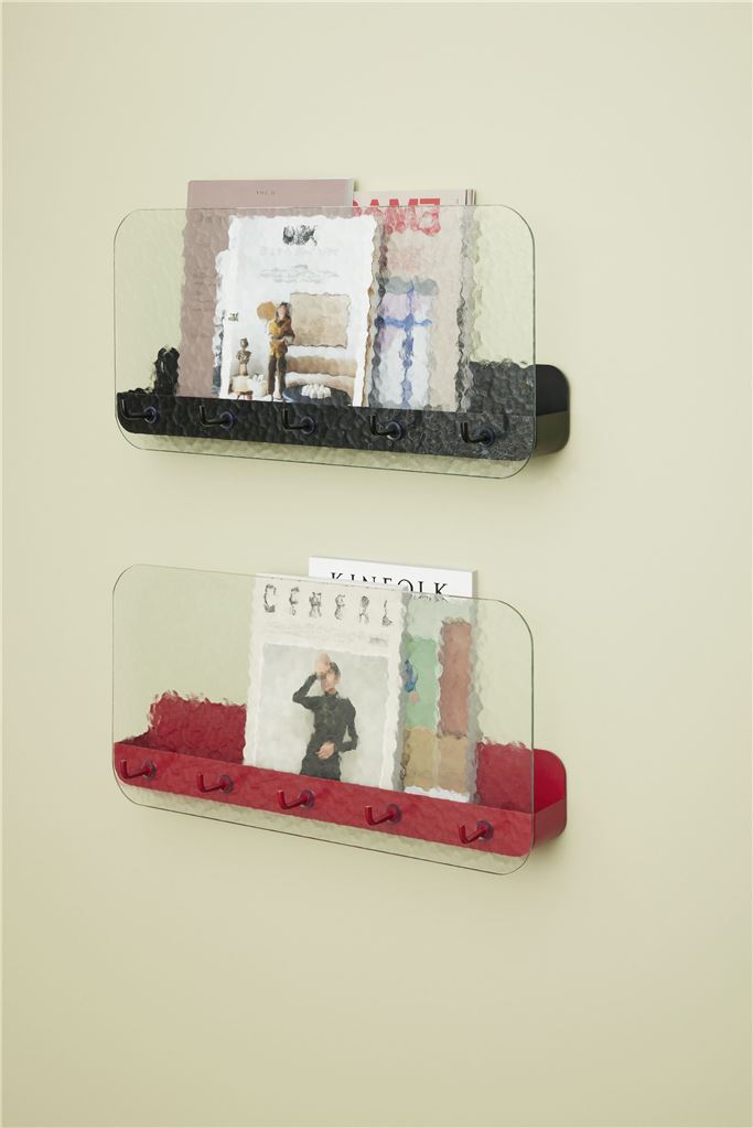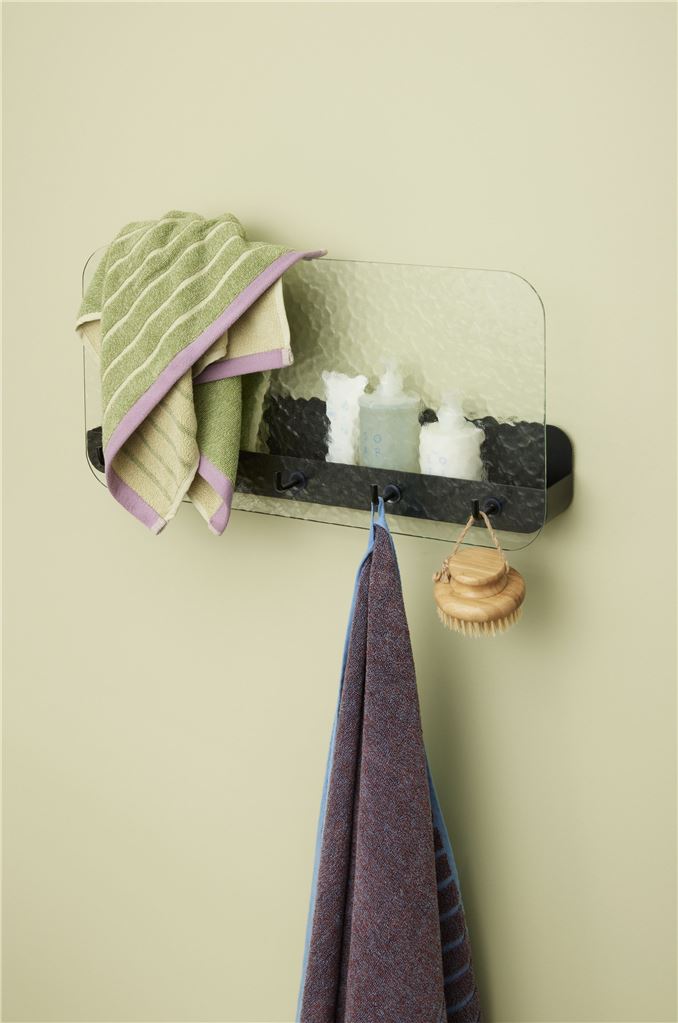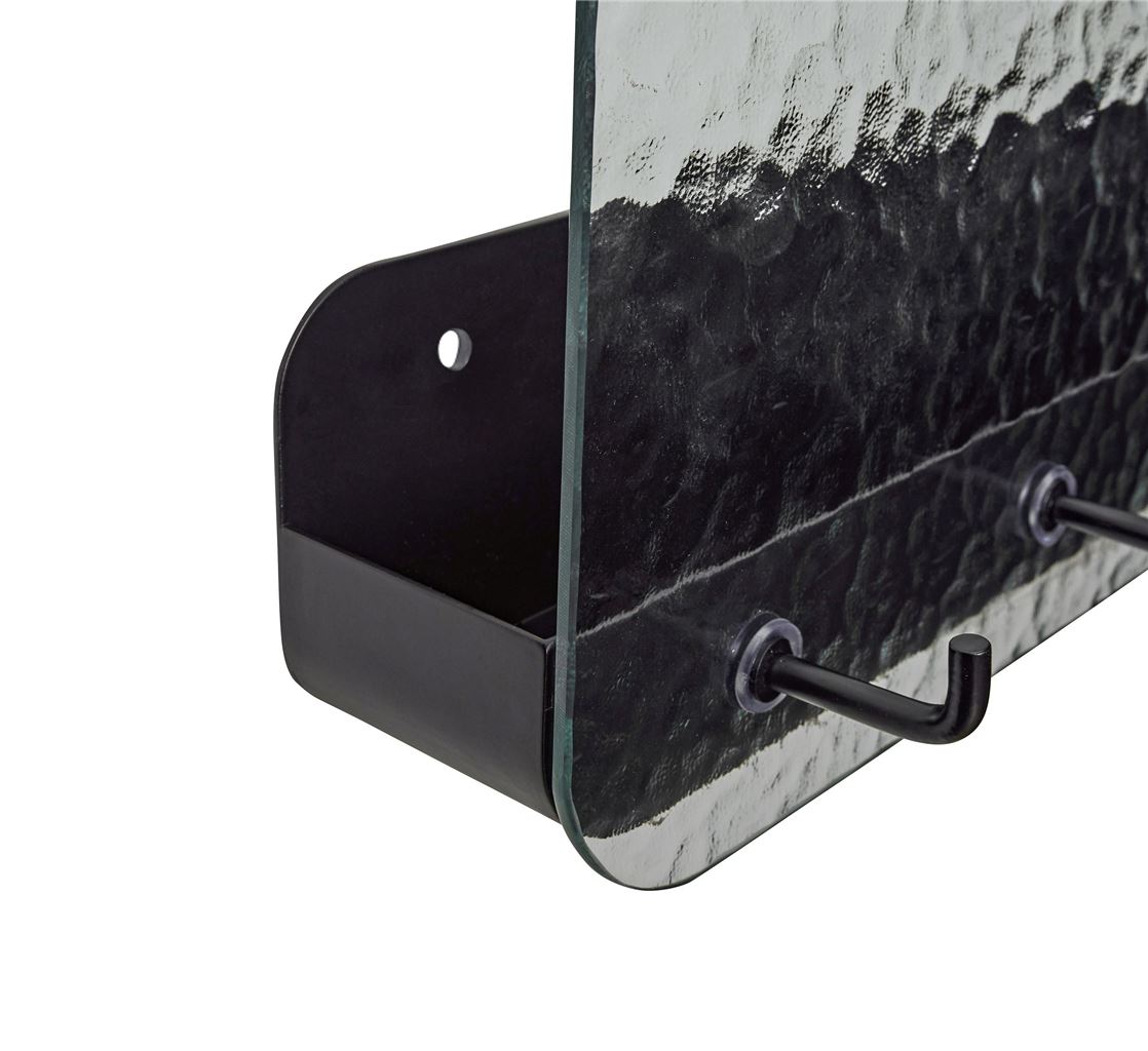 Skøn hylde fra Hübsch. Hylden har flere forskellige funktioner og kan derfor også bruges på flere forskellige måder og i flere forskellige rum. Hylden har både en hylde, en fin glas plade der skjuler hylden samt en række med knager. Hylden er ideel på både badeværelset eller i entréen. Brug den til opbevaring af badeværelsesartikler og håndklæder, eller til opbevaring af nøgler, punge mm. Hyldens design har noget kant og glas pladen tilfører noget ekstra til designet, den vil derfor pynte fint på væggen. Hylden kommer i flere forskellige farver.