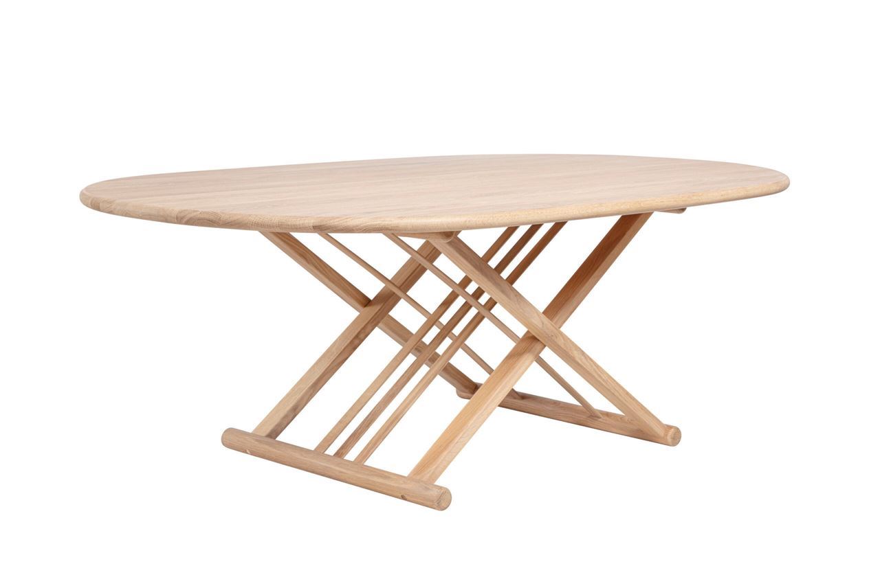 Smukt og utraditionelt sofabord fra Haslev. Bordets har krydsunderstel og har justerbar højde der indstilles i 6 forskellige indstillinger. Det fine sofabord er lavet i massivt egetræ og har en oval form. Bordet er perfekt som sofabord og passer ind i de fleste nordiske indretninger.