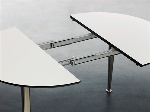 Denne model måler 105x180 cm. og har en smuk ellipseform, der giver et eksklusivt udtryk i dit hjem. Spisebordet har udtræk til to tillægsplader, der kan tilkøbes separat, så du har mulighed for at udvide bordet når du får gæster. Splitbenene er fremstillet i krom.