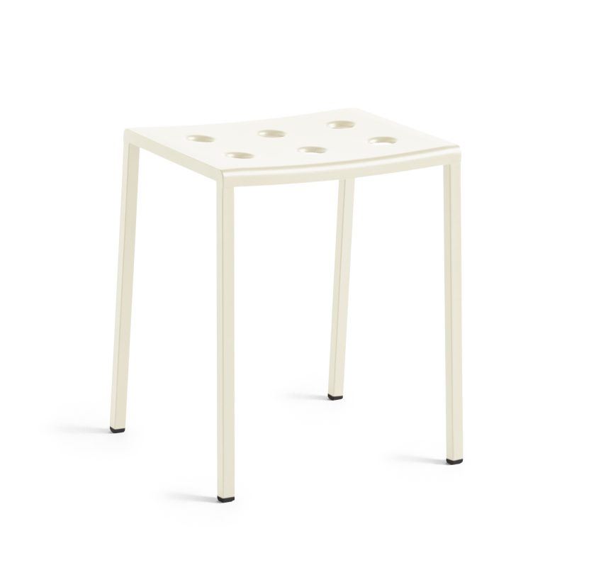 HAY Balcony Stool er designet af Ronan og Erwan Bouroullec og er en funktionel skammel til udendørs brug. Balcony serien forener et rektangulært design med bløde, imødekommende former og slanke ben. Hullerne i sædet styrker konstruktionen samtidigt med, at den skaber et særligt udtryk. Balcony Stool er lavet i pulverlakeret stål med en udendørs primer for optimal holdbarhed. Skamlen kommer i forskellige farver, hvilket gør den egnet til en bred række indretninger, og kan bruges til indretning af alt fra udendørs områder til altaner.