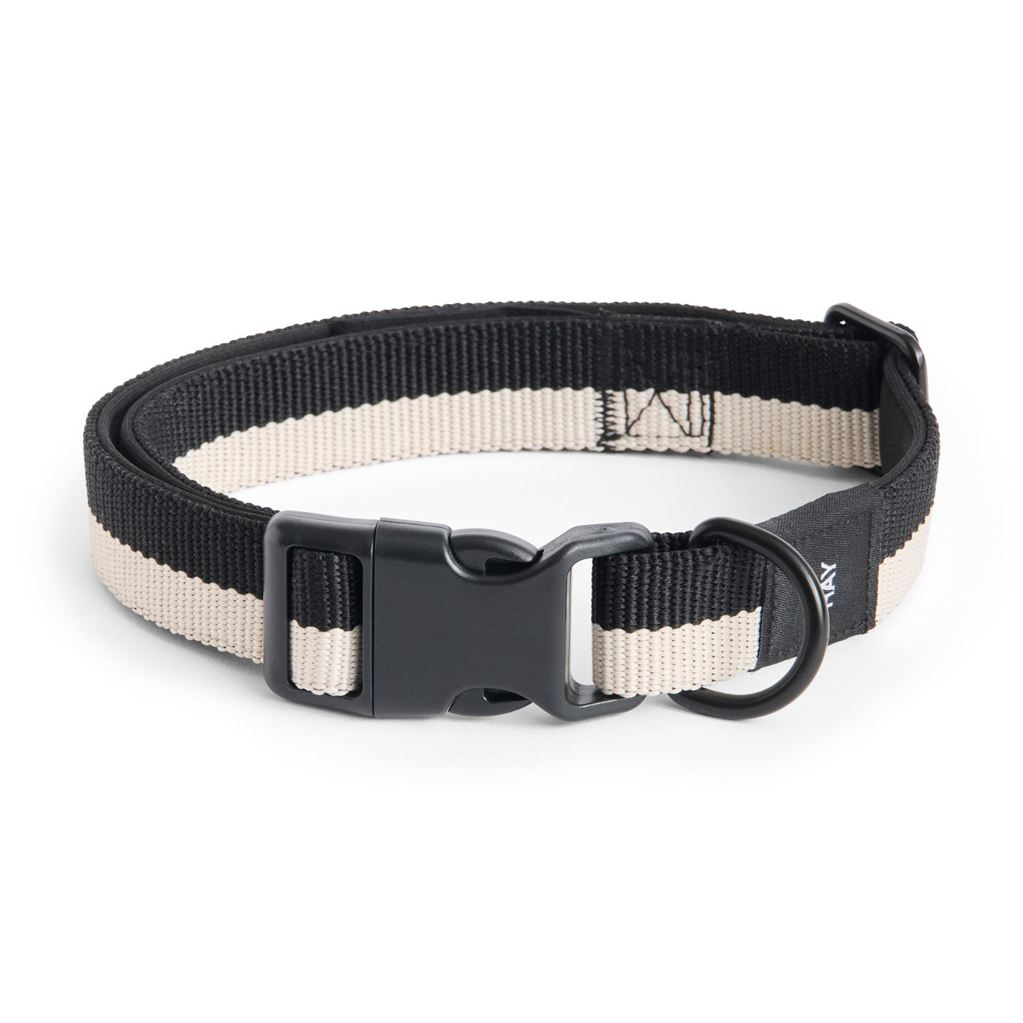 Hundehalsbåndet "Dog Collar Flat" er fremstillet af stærkt genanvendt polyester, har en justerbar spænde og ekstra polstring for optimal blødhed og komfort. Halsbåndet fås i to størrelser og kommer i forskellige stribede designs, der passer til hundesnoren fra samme kollektion.