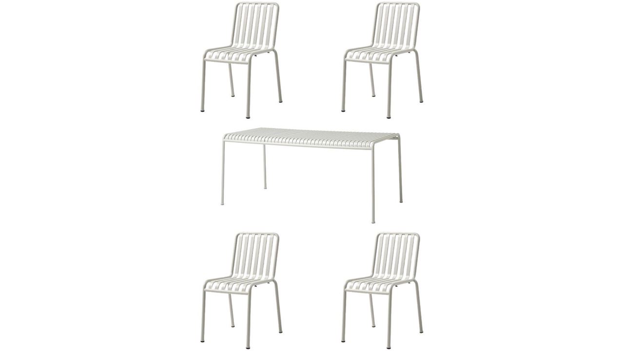 HAY Palissade sæt bestående af bord og 4 stole. Sættet er ideelt til have eller terrasse og giver mulighed for at samles på de varme sommer aftener. Skab en smuk sammenhæng i det udendørs rum med dette stilrene havesæt.