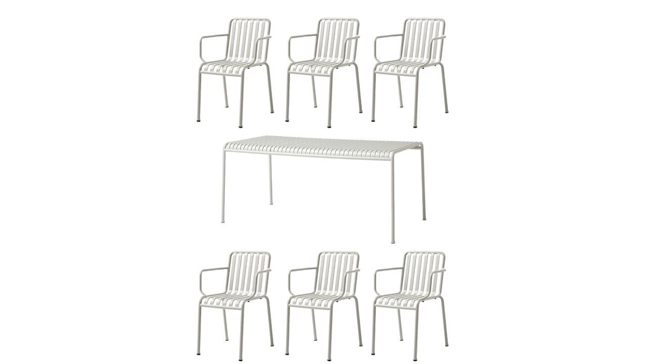HAY Palissade sæt bestående af bord og 6 armstole. Sættet er ideelt til have eller terrasse og giver mulighed for at samles på de varme sommer aftener. Skab en smuk sammenhæng i det udendørs rum med dette stilrene havesæt.