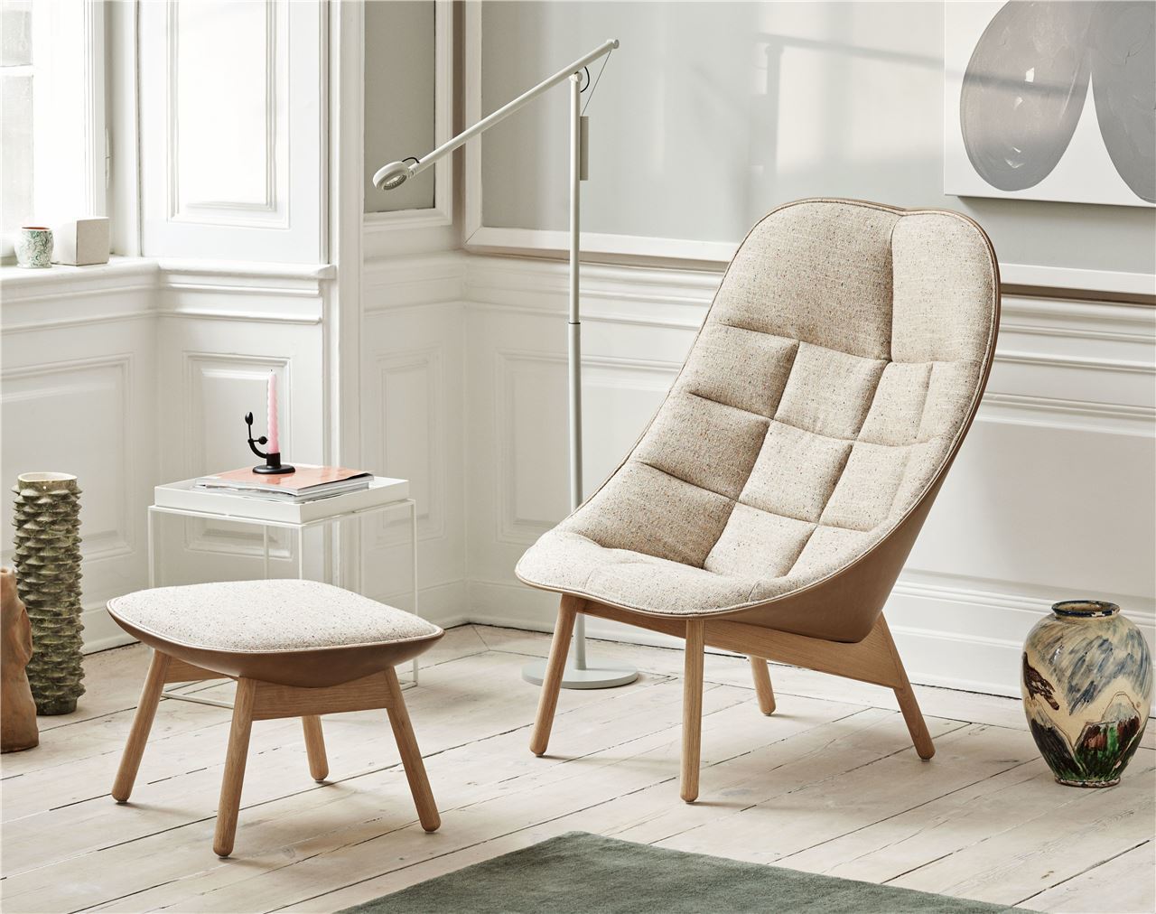 Flot lænestol Uchiwa fra HAY. Stolen er designet af Doshi Levien og er inspireret af de japanske håndvifter. Det er en yderst rummelig og stor lænestol med plads til fordybelse og afslapning. Tag din yndlingsdrik og find en god bog og sæt dig godt til rette. Uchiwa lænestolen er til dig der ønsker en god lænestol, som har en åben form og en følelse af fordybelse. Uchiwa stolen kommer i flere farver og i to versioner: en blød quiltet model til det hyggelige hjemmemiljø og en i støbt skum til en mere krævende kontrast.