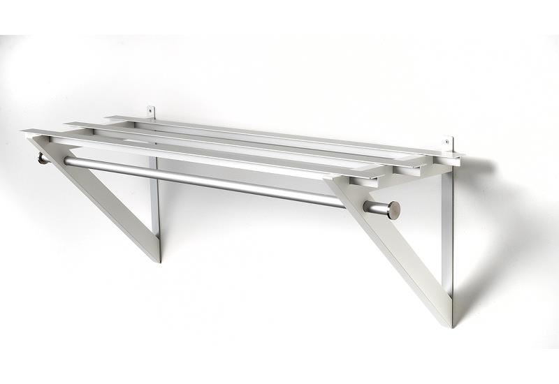 En nydelig HH-6 Hattehylde fra Hoigaard. Hattehylden er en kombination af en vandret overflade til cykelhjelme eller opbevaringskurve og en bøjlestang til overtøjet. Træets farve og det eloxeret aluminium giver en elegant blanding af de enkelte materialer. Eloxeret aluminium er slidsstærkt materiale.
