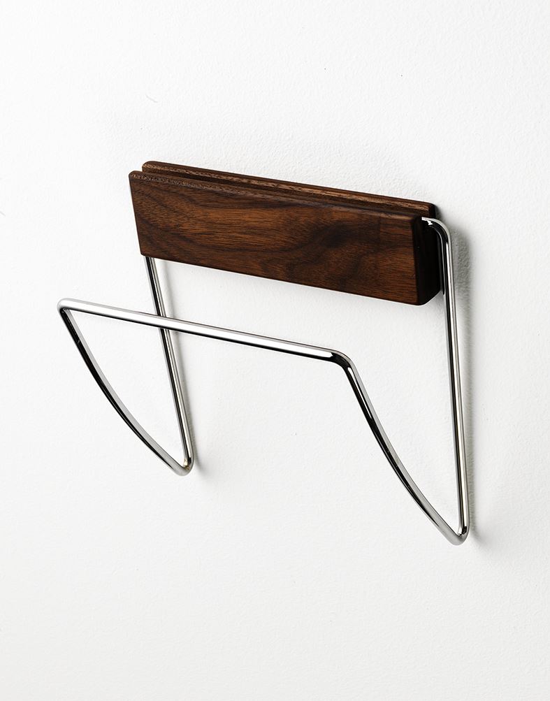 Holderen kommer i massiv træ eller farvelakeret bøgetræ og rustfrit stål.