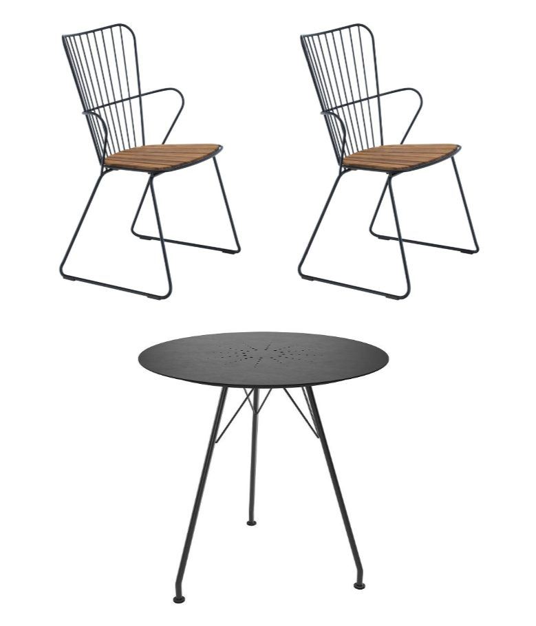 Circum fra HOUE er et rundt cafe bord. Bordpladen er lavet af pulverlakeret stål og det samme gælder stellet. Den fine størrelse på bordet gør det nemt at placere på en mindre terrasse sammen med nogle fine havestole. Circum har et råt og skandinavisk udtryk, dog med et strejf af fransk romantik. Smuk havestol fra HOUE. Stolen er designet af danske Henrik Pedersen og er fremstillet i pulverlakeret metal og bambuslameller. Paon har et let og skandinavisk udtryk, dog med et strejf af fransk romantik. Af en metalstol at være, så har Paon en utrolig siddekomfort, som man ikke forventer. Den afrundede ryg er nemlig med til at omfavne dig med tryghed og komfort, der resulterer i total afslapning på terrassen.