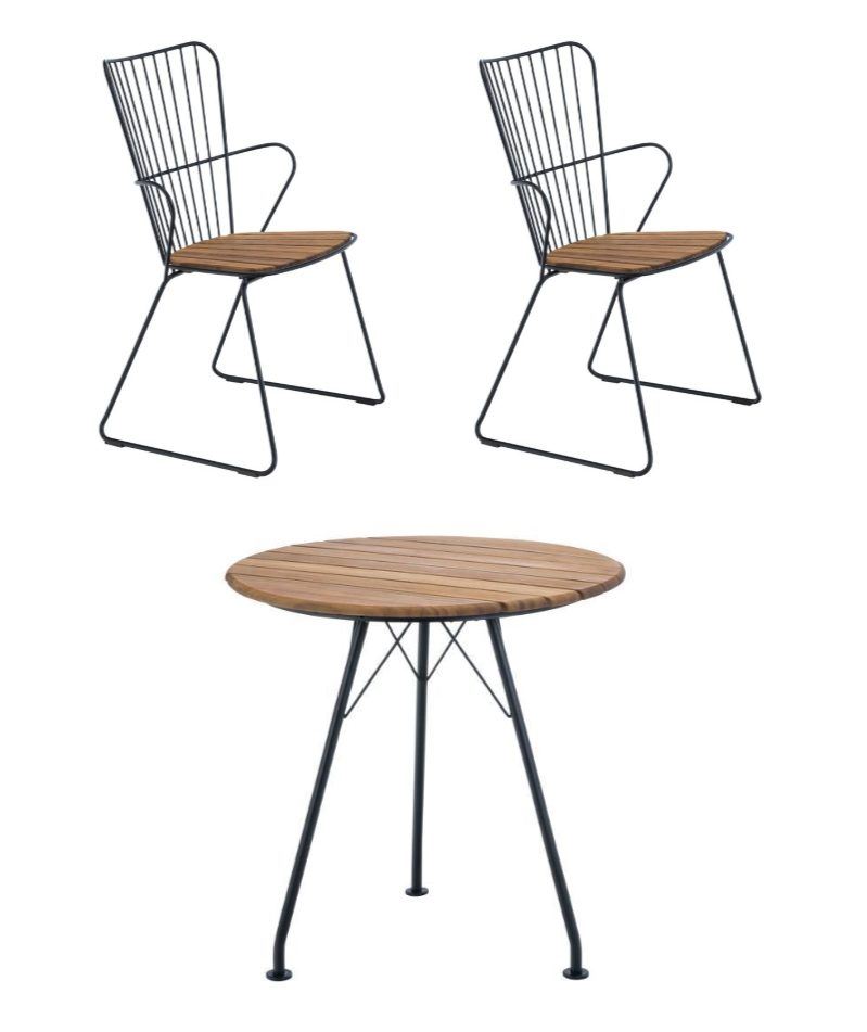 Circum fra HOUE er et rund cafe bord. Bordpladen er lavet af bambus lameller og stellet er af pulverlakeret stål. Den fine størrelse på bordet gør det nemt at placere på en mindre terrasse sammen med nogle fine havestole. Circum har et let og skandinavisk udtryk, dog med et strejf af fransk romantik. Smuk havestol fra HOUE. Stolen er designet af danske Henrik Pedersen og er fremstillet i pulverlakeret metal og bambuslameller. Paon har et let og skandinavisk udtryk, dog med et strejf af fransk romantik. Af en metalstol at være, så har Paon en utrolig siddekomfort, som man ikke forventer. Den afrundede ryg er nemlig med til at omfavne dig med tryghed og komfort, der resulterer i total afslapning på terrassen.