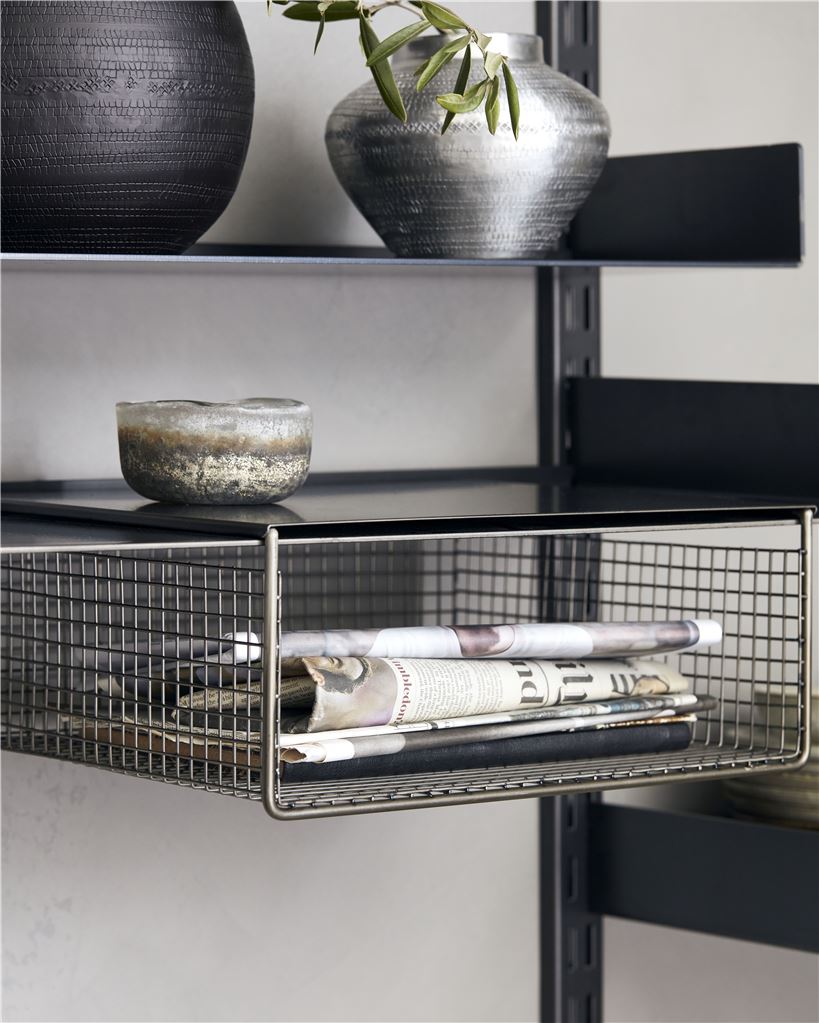 Funktionel og stilren tilføjelse til dit hyldesystem fra House Doctor. De to metalkurve er designet i samme stål med glat, sort belægning, som bringer nyt liv til dine hylder. Skub kurvene ind over den nederste hylde og brug dem som moderne magasinholdere eller til at opbevare dine yndlingsdrikkeglas. På denne måde opbevares og vises dine fine ting på en stilfuld måde takket være det lette design. Max vægt pr. kurv: 5 kg