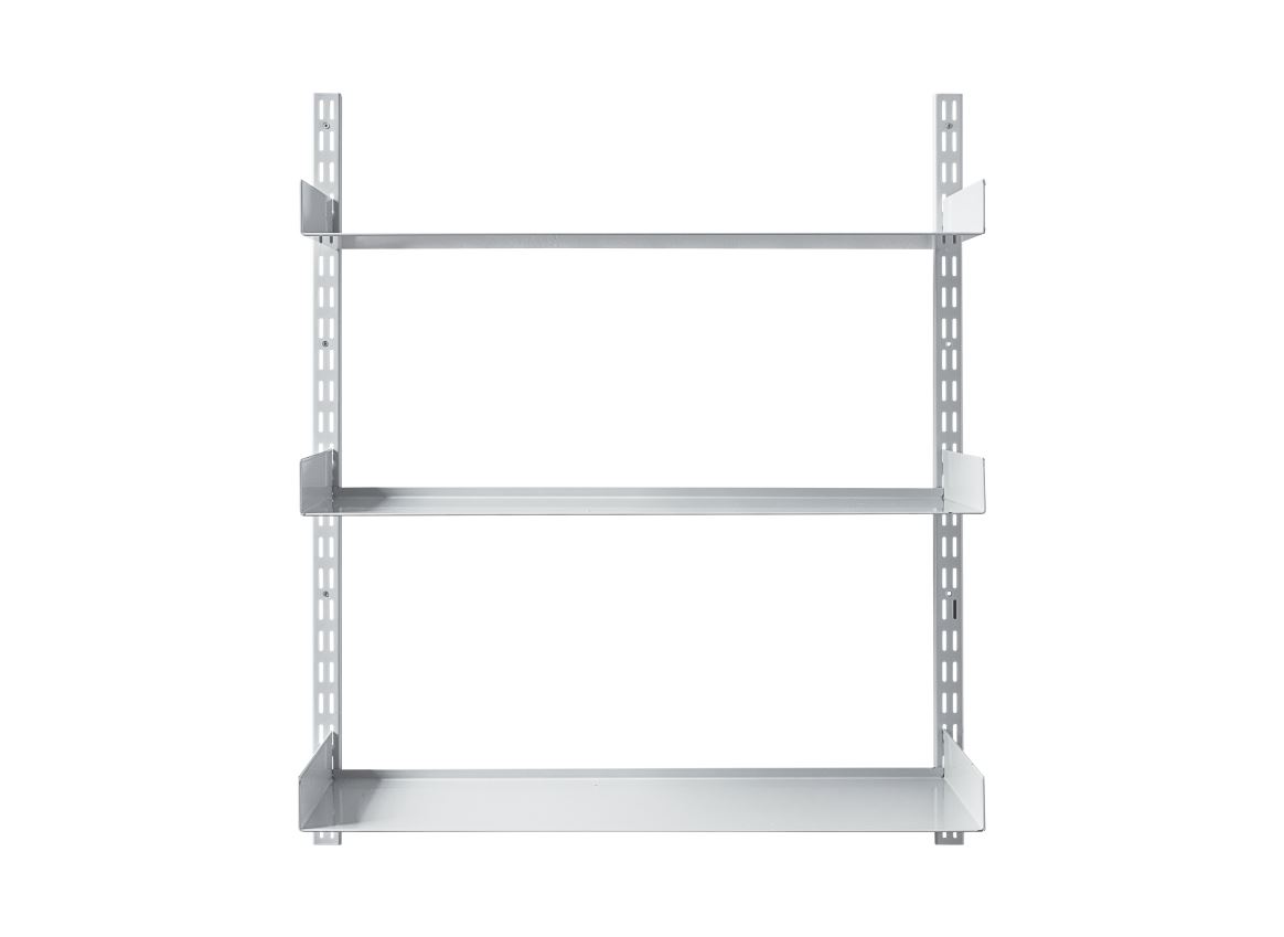 Funktionelt og stilrent hyldesystem fra House Doctor. Åbne hylder er en populær, dekorativ og ikke mindst funktionel måde at opbevare dine ting på. Med et åbent hyldesystem kan du fremvise dine yndlingsnips, planter, bøger og det som karakteriserer dig og din indretning. Fari hyldesystemet fra House Doctor er fremstillet af stål, hvilket giver hyldesystemet et råt og raffineret strejf, som vil passe godt til de fleste omgivelser. De 3 hylder monteres nemt på væggen med de tilhørende beslag og kan nemt justeres i højden. Det du vælger at stille på hylderne opbevares og udstilles på samme tid. Placer hylderne i køkkenet og udstil dit yndlingsstel eller endda krydderier. Du kan naturligvis også bruge hylde systemet i stuen og pynte hylderne med planter eller bøger.