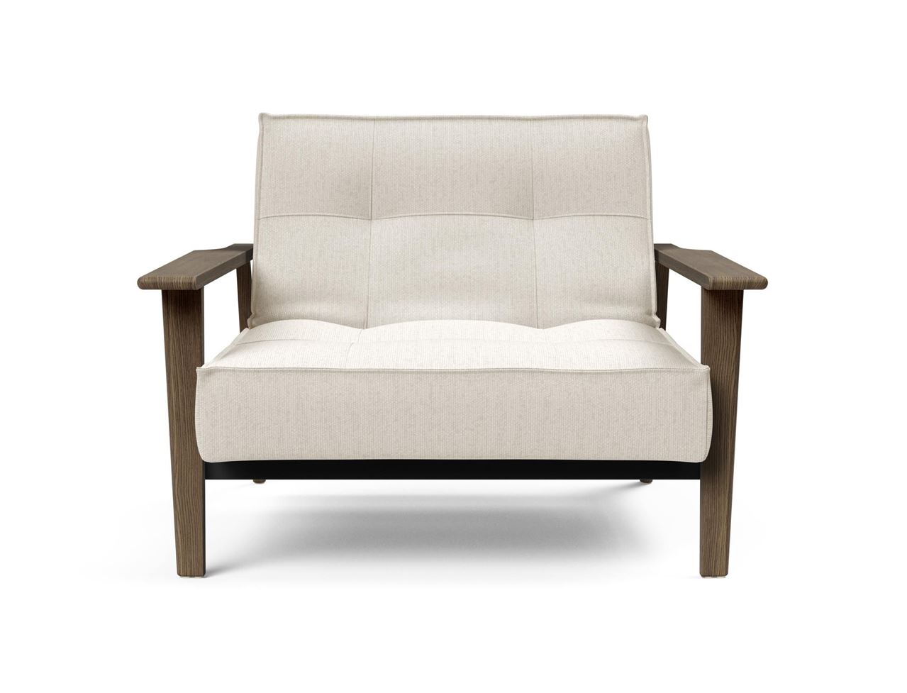 Skøn stol fra Innovation Living, designet af Per Weiss, Oliver & Lukas WeissKrogh. Med denne stol får du et multifunktionelt design, med et varmt nordisk design. Det røget eg stolens armlæn og ben er udformet af, tilføjer et mere varmt ydre, derudover tilføres der også et touch af dansk design til dit hjem og din indretning. Stolen kan bruges som et ekstra modul til din Splitback Frej sovesofa, hvis ryggen på stolen ligges helt ned, kan den tilføjes som chaiselong. Du kan også placere to stole i forlængelse af hinanden og skabe en soveplads for en enkelt person. Stolen tilbyder derfor både en god siddeplads, samt soveplads til overnattende gæster. Stolen kan naturligvis også benyttes alene, både med ryggen i oprejst position, eller med den tilbagelænet position der giver en mere afslappet komfort. Med denne kollektion skaber du et hav af muligheder til din stue.