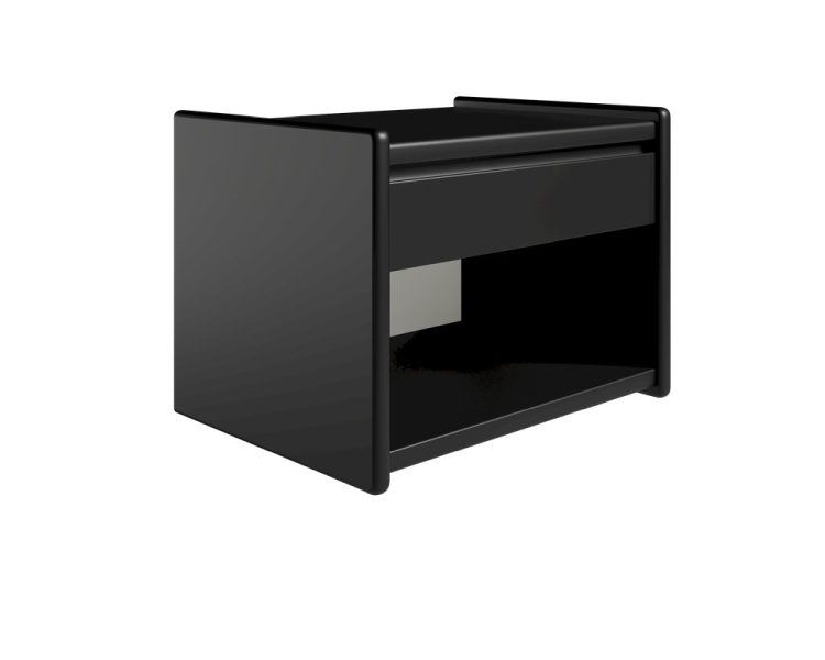 Sengebord fra danske Kaagaard. 215037 sengebordet har et enkelt design med elegante afrundede hjørner. Bordet består af en skuffe og et åbent rum. Sengebordet er sortmalet og har et minimalistisk design, som med fordel kan tilføjes til eksisterende indretninger, og som passer ideelt i de skandinaviske indretninger.
