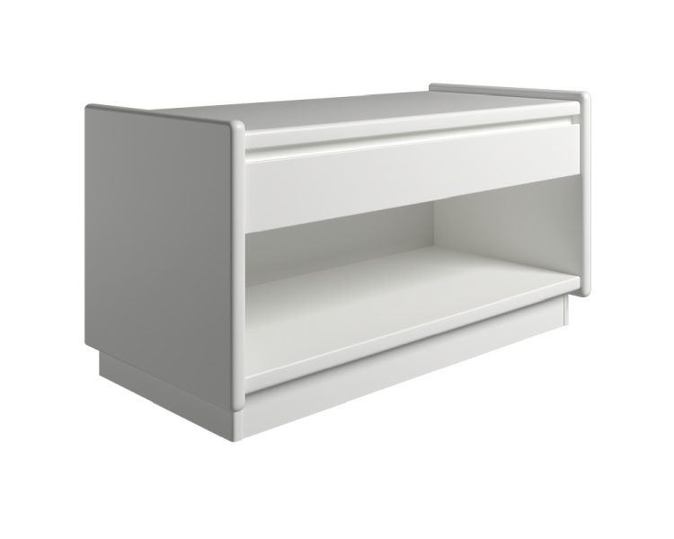 Sengebord fra danske Kaagaard. 218037 sengebordet har et enkelt design med elegante afrundede hjørner. Bordet består af en skuffe og et åbent rum. Sengebordet kommer i en hvid farve og har et minimalistisk design, som med fordel kan tilføjes til eksisterende indretninger, og som passer ideelt i de skandinaviske indretninger.