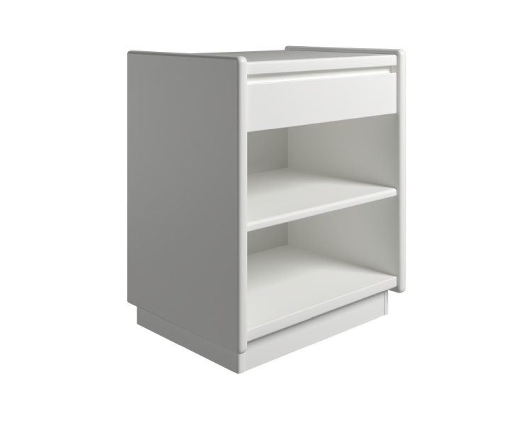 Sengebord fra danske Kaagaard. 315037 sengebordet har et enkelt design med elegante afrundede hjørner. Bordet består af en lav skuffe og to hylder med en masse plads til opbevaring. Bordet er hvidmalet og har et minimalistisk design, som med fordel kan tilføjes til eksisterende indretninger, og som passer ideelt i de skandinaviske indretninger.